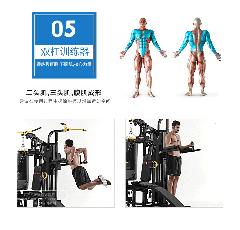 功能特點:夾胸/前推,高低位拉桿,綁腿帶訓練,勾腿訓練,雙桿訓練,斜仰臥板,蹬腿訓練,拳擊訓練等